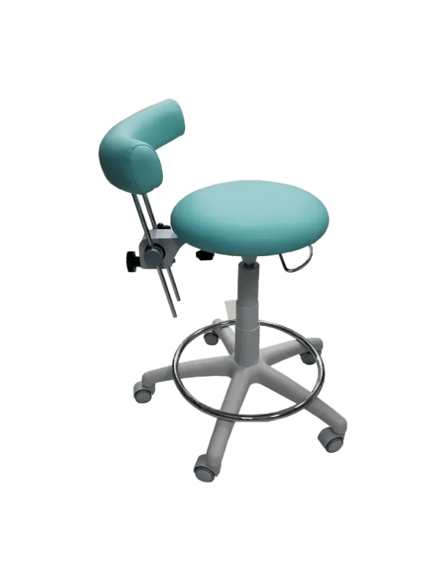 Стул с подставкой-кольцом для ног, стальная конструкция, поворотными на 360 градусов колёсами. Покрытием из пелтекса, регулировкой высоты с помощью газлифта, поворотом на 180 градусов и полностью регулируемой спинкой. Стул обтянут тканью skai (устойчивой к царапинам и воздействию кислот) с наполнителем из пены высокой плотности.